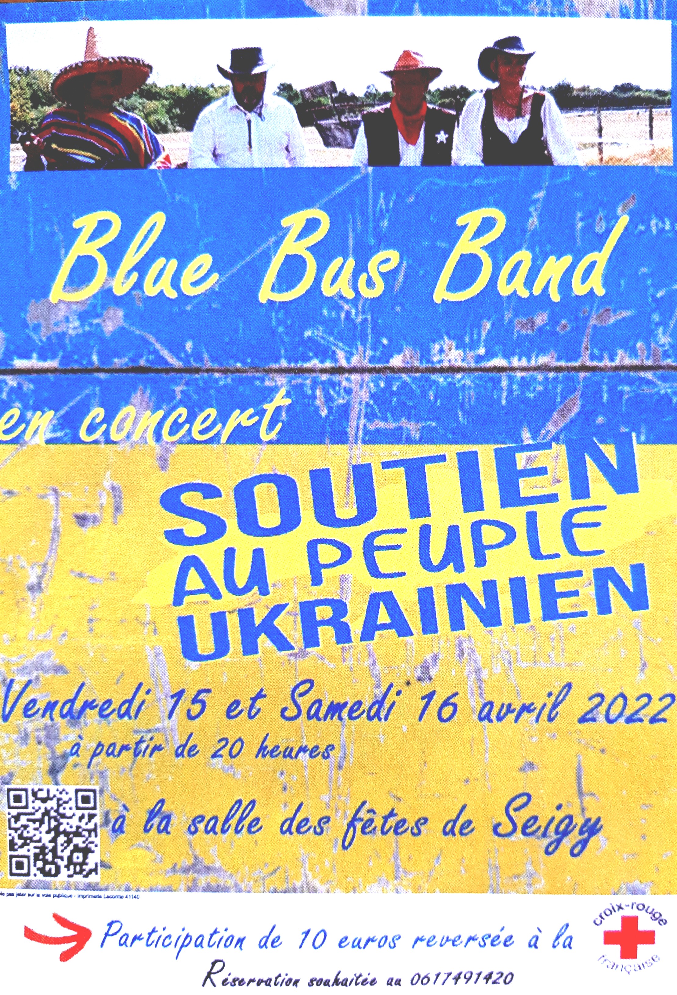 Le foyer rural et le groupe Blue Bus Band (pop rock folk country blues) organisent 2 concerts le vendredi 15 et Samedi 16 avril prochain à 20h dans la salle des fêtes de Seigy dont tous les fonds seront reversés pour venir en aide aux familles Ukrainiennes arrivées dans la vallée du Cher.
