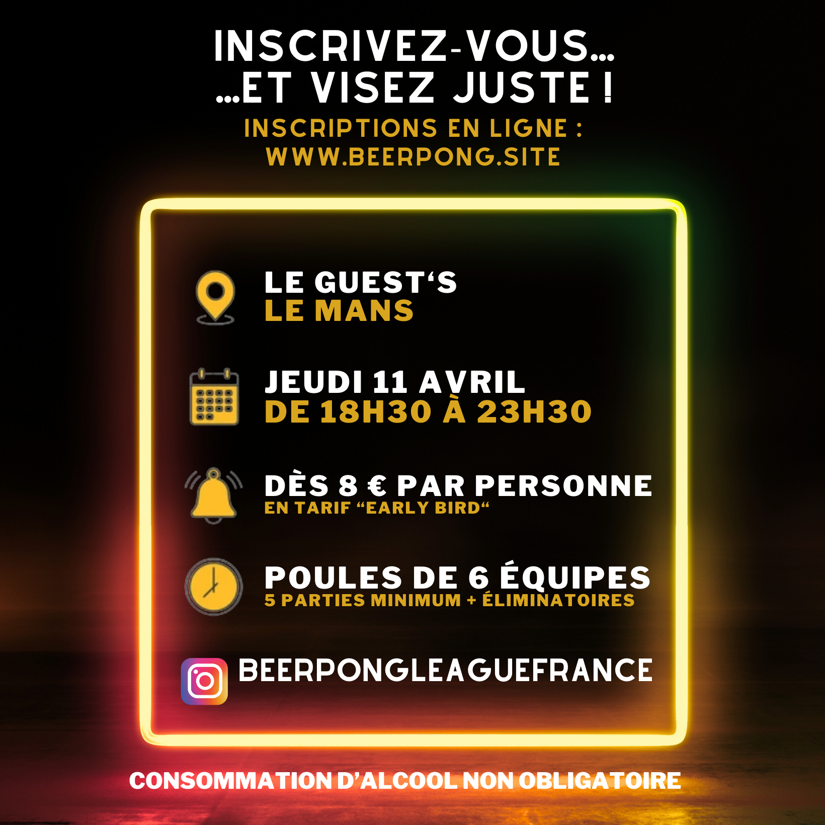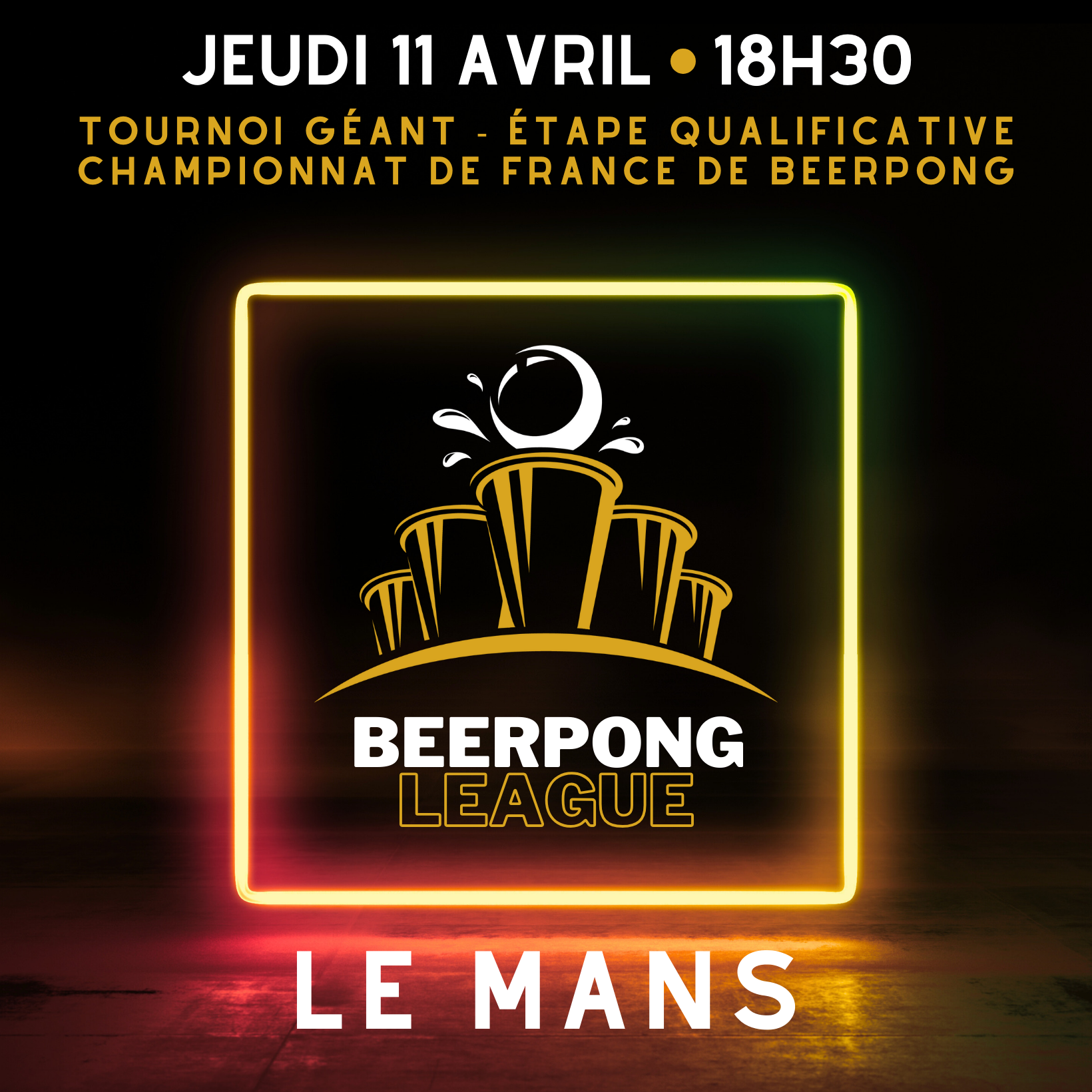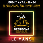 De Lisa R.đ On te donne rendez-vous le jeudi 11 avril au Mans pour un tournoi de beerpong gĂ©ant (prĂšs de 200 participants attendus) qualificatif pour le Championnat de France, de nombreuses animations, et plus de 300 ⏠de lots garantis dĂ©barque pour retourner Le Mans !