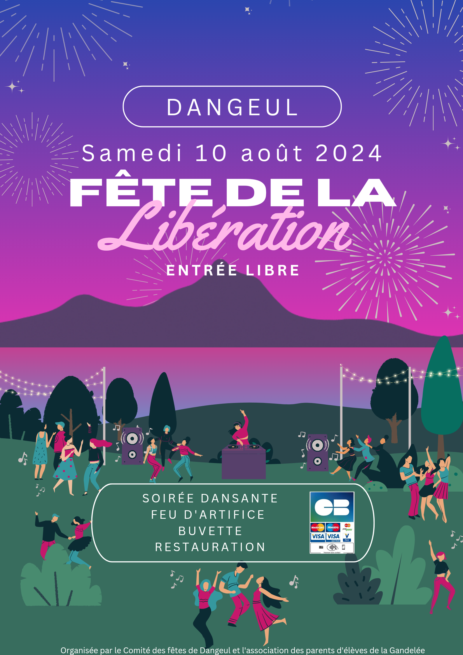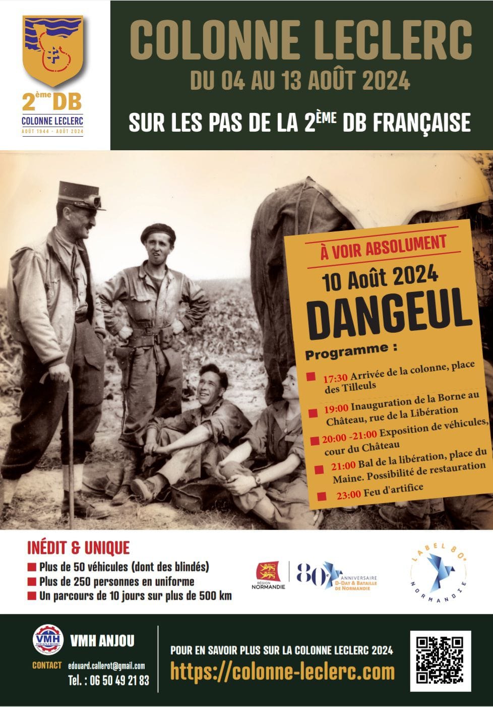 Dangeul fête le 80ème anniversaire de sa libération. A cette occasion, la borne de la 2eme DB sera inaugurée à partir de 19h. Une cinquantaine de véhicules militaires de la 2eme DB, qui a libérée le nord Sarthe, seront exposés dans la cour du Château de 20h à 21h. Une soirée dansante avec possibilité de restauration sur place clôturera cette journée, sur le terrain de foot du village. Un feu d'artifice offert par la mairie sera tiré vers 23h.