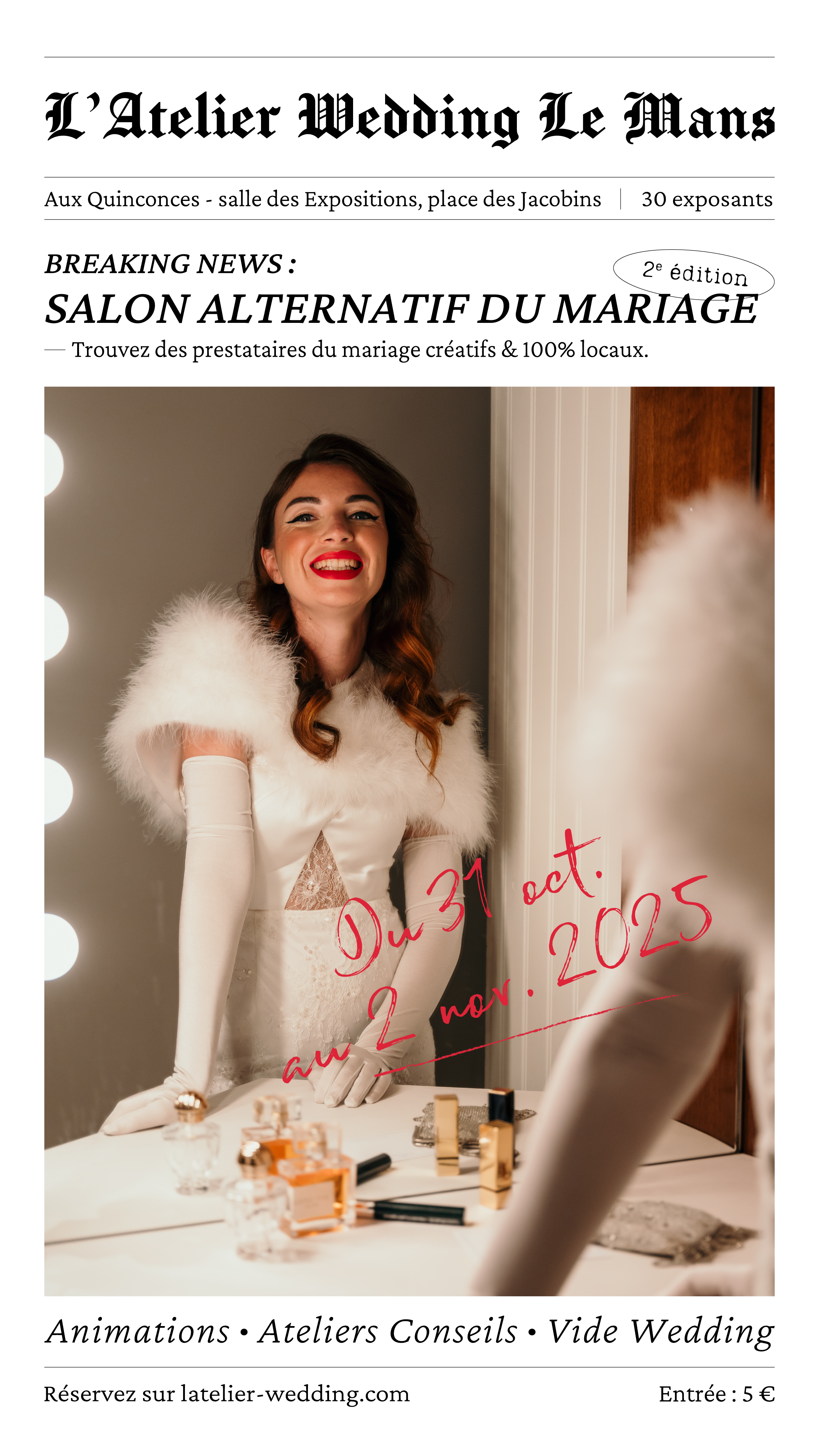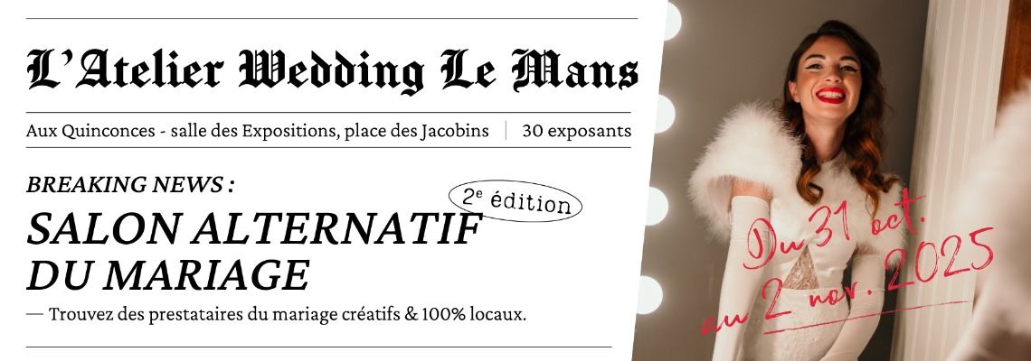 Sa 2eme édition se déroulera les samedi 1er et dimanche 2 novembre 2025. Venez y rencontrer notre sélection de prestataires de mariage locaux et participer à leurs ateliers conseils dans une ambiance bienveillante, conviviale et chaleureuse.
