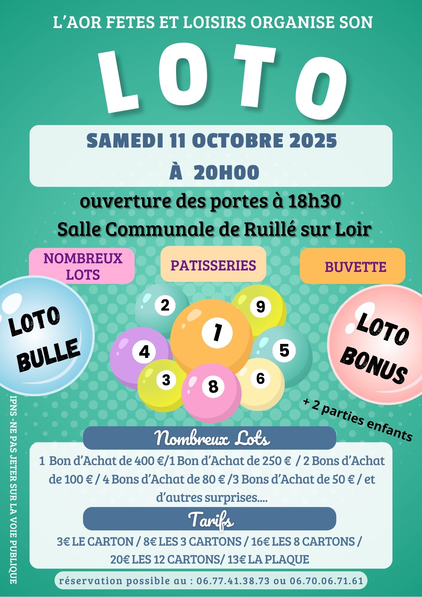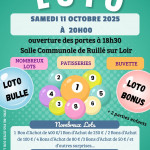 L'AOR Fêtes et Loisirs organise un loto le samedi 11 octobre 2025 à 20h00. Plusieurs bons d'achat à gagner de 400 € à 50 € et de nombreux autres lots. Présence d'un Loto bonus et d'un loto bulles. Il y a 2 parties enfants. Vente de pâtisseries. Ouverture des portes à 18 h 30. Tarif : le carton 3€, 3 cartons 8€, la plaque 13€, 8 cartons 16€, 12 cartons 20€. possibilité de réservation au : 06 77 41 38 73, 06 70 06 71 61, aorfl72340@gmail.com.