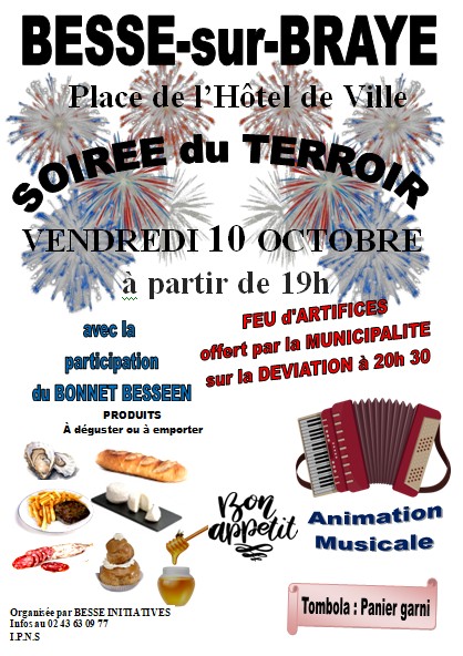 Dans le cadre de la semaine du goût, la Soirée du Terroir, repas en musique en plein air sous barnum, se déroulera le vendredi 10 octobre 2025 de 19h à 23h, place de l'Hôtel de Ville de Bessé sur Braye.