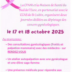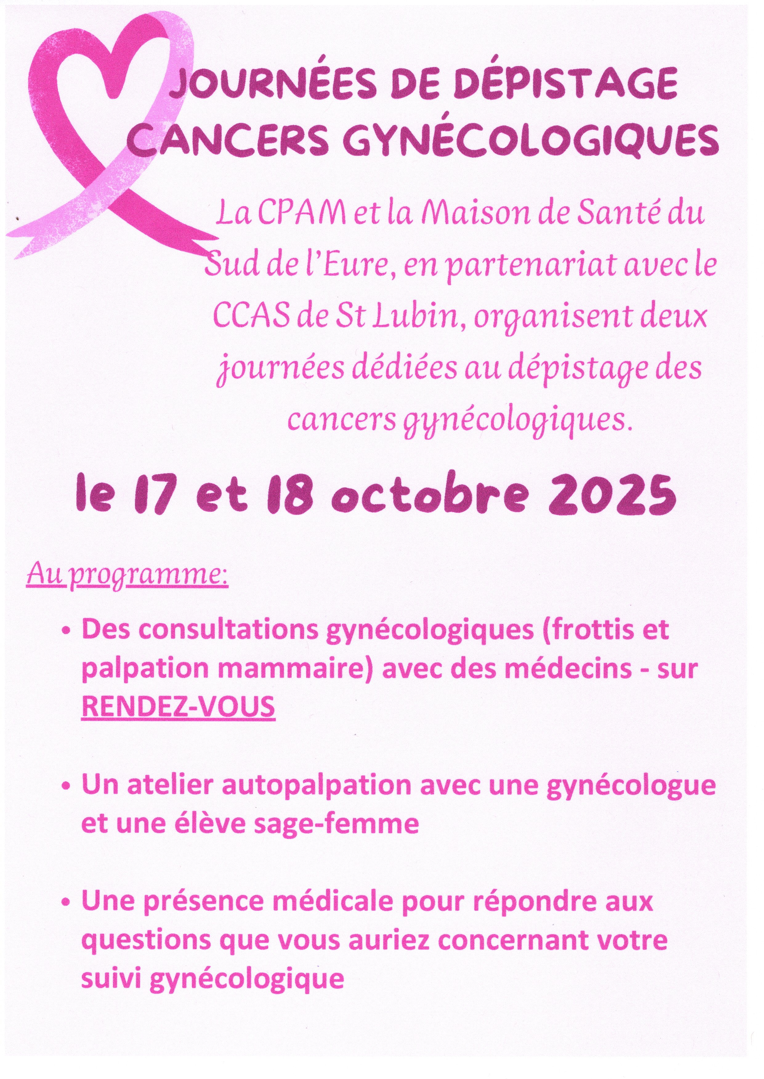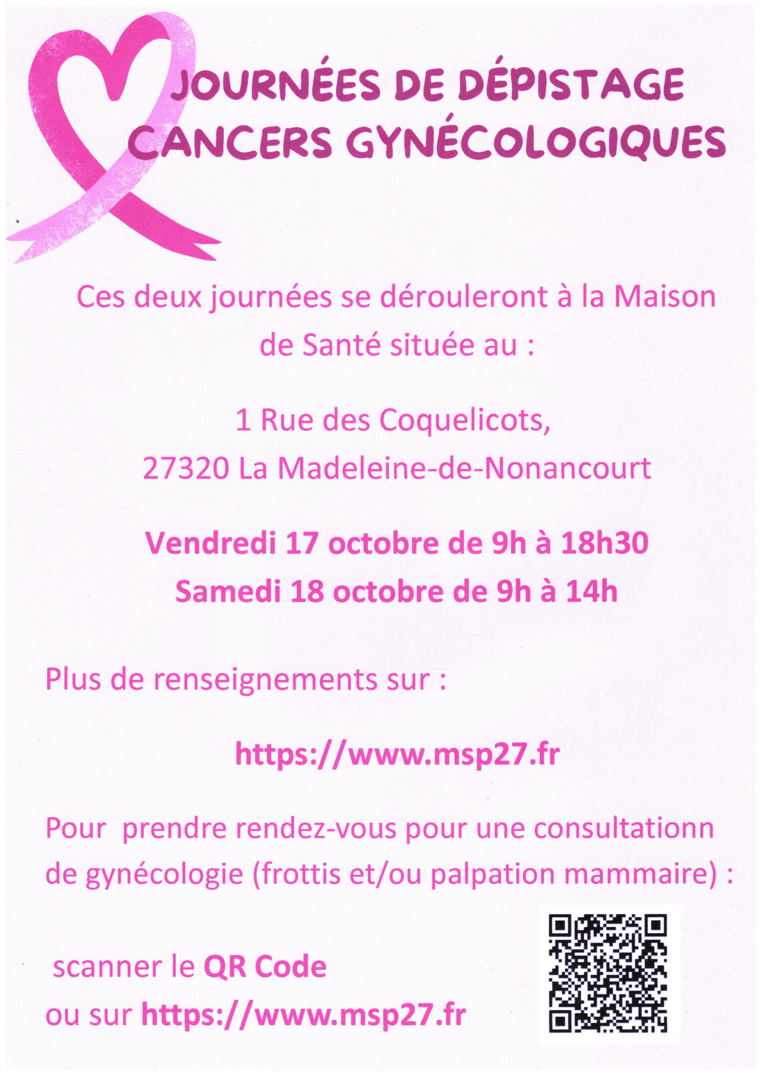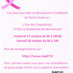 La CPAM et la Maison de santé du sud de l'Eure, en partenariat avec le CCAS de Saint Lubin des joncherets, organisent deux journées de dépistage des cancers gynécologiques. Les vendredi 17 octobre, de 9h à 18h30, et samedi 18 octobre, de 9h à 14h, à la Maison de santé, 1 rue des coquelicots 27320 La Madeleine de Nonancourt. Consultations gynécologiques sur rendez-vous, atelier d'auto-palpation et échange avec les médecins. Plus d'infos sur www.msp27.fr