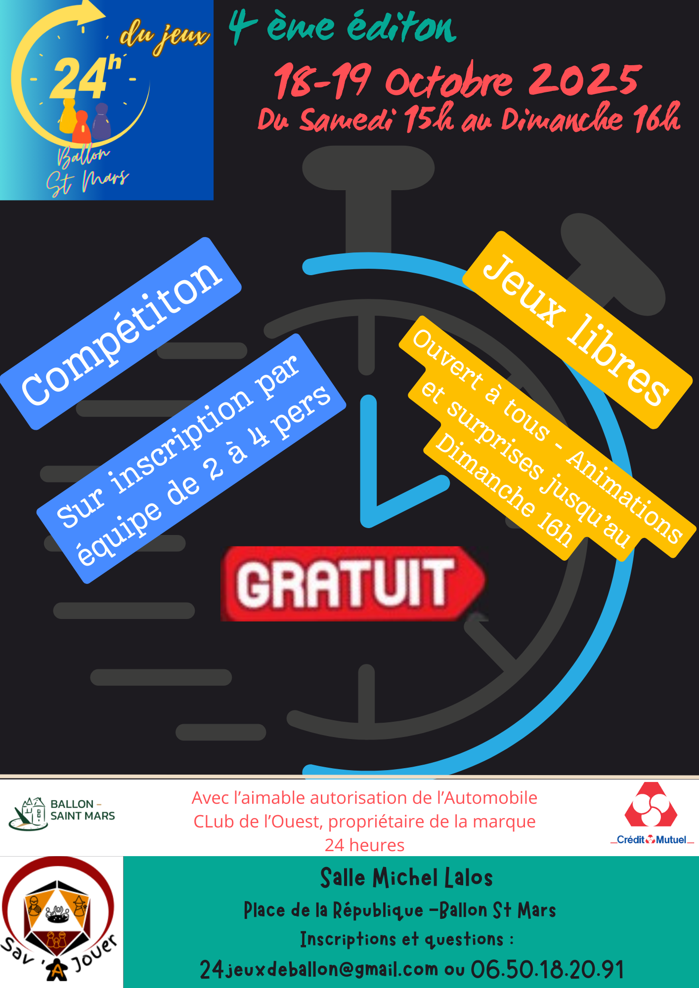 4ème édition des 24h du jeu, à Ballon-Saint Mars. Évènement gratuit pour tous. Plus de 300 jeux en libre accès. Jeux pour tous dès 2 ans et demi. 1 partie jeux libres, sans inscription et 1 partie compétition (24h non stop) par équipe de 2 à 4 personnes sur inscription.