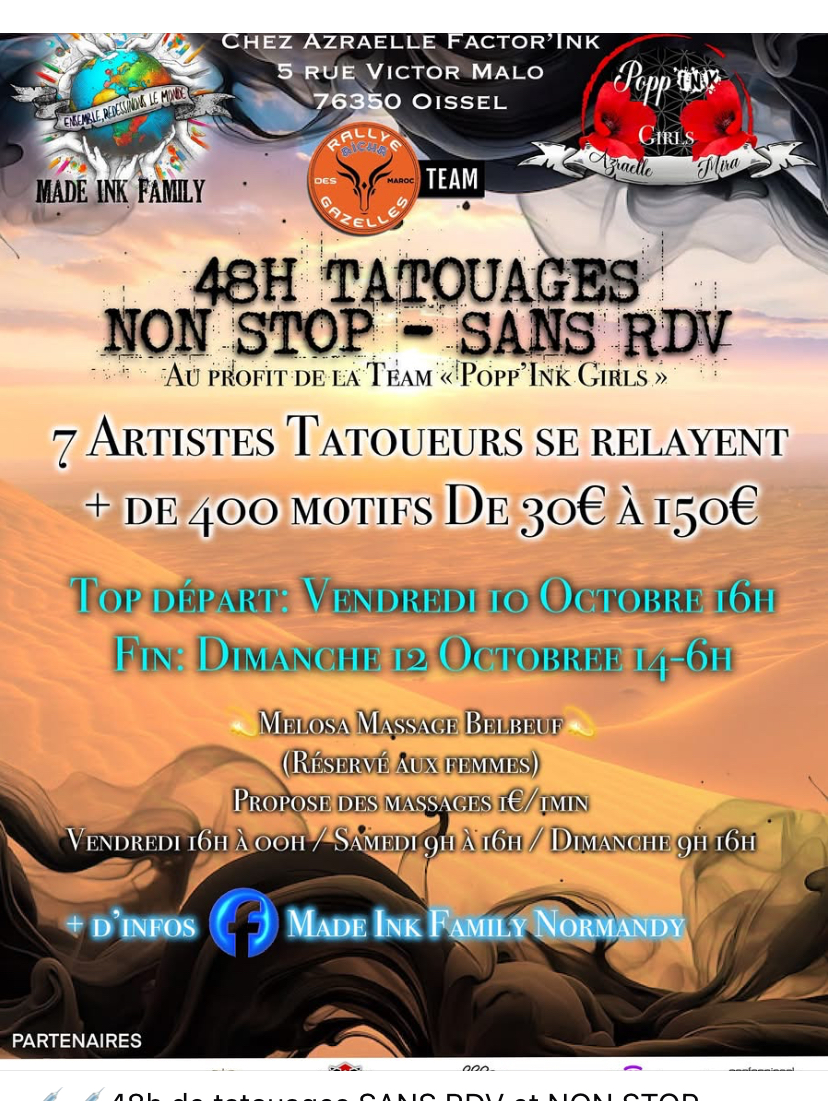 Les tatouages seront réalisés en NON STOP du vendredi 10 Octobre 16h au dimanche 12 Octobre 16h
