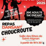 Le Foyer Laïque du canton de Saint Aignan organise un repas dansant choucroute le samedi 15 novembre 2025 à partir de 19 heures 30 à la salle des fêtes de Saint Aignan.