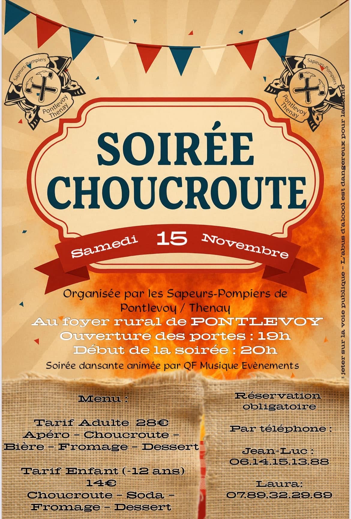 Les Sapeurs Pompiers de Pontlevoy-Thenay ont le plaisir de vous annoncer le retour de notre soirée choucroute annuelle le samedi 15 novembre 2025 au foyer Rural de Pontlevoy !