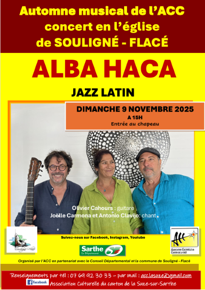 Après un premier concert plein de générosité et d’émotion le 12 octobre dernier en l’église Saint-Léonard à Louplande, l’Association Culturelle du Canton de la Suze (ACC), associée à la commune de Souligné-Flacé, est heureuse de vous convier à une seconde prestation du groupe Alba Haca formé en trio par Joëlle Carmona, Olivier Cahours et Antonio Clavijo.