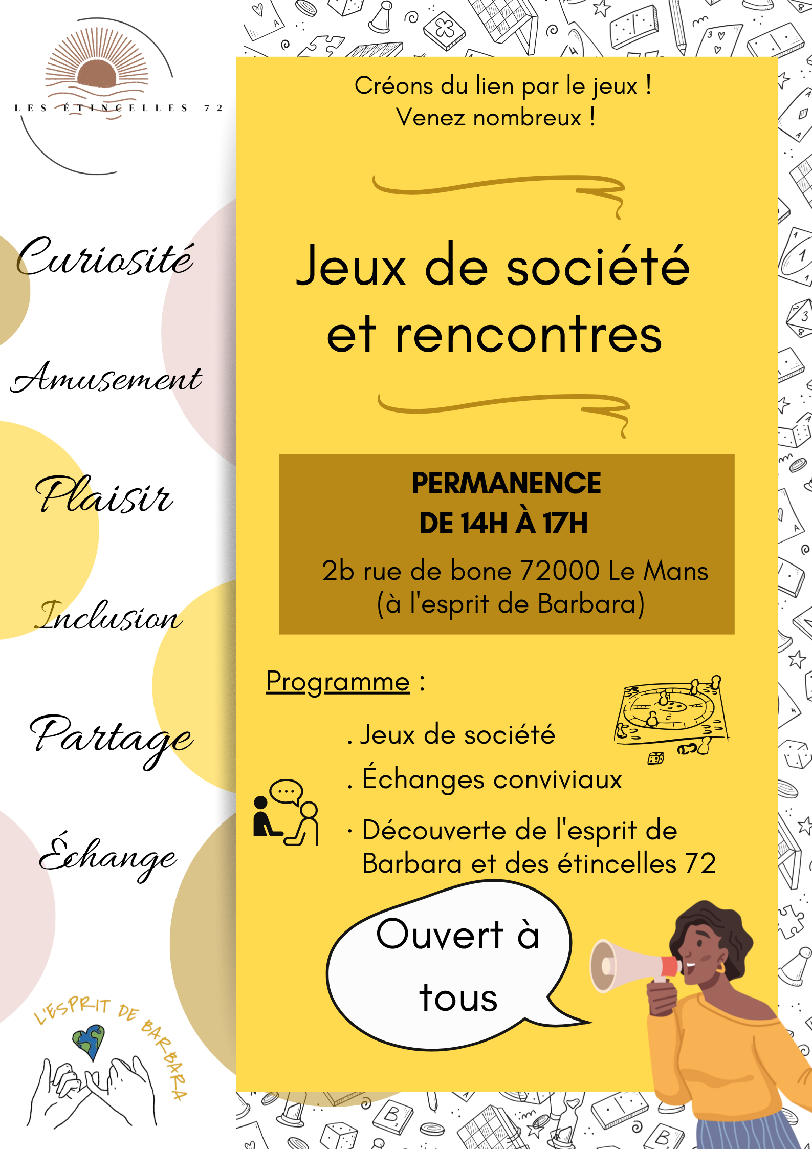 Dans le cadre de ses actions en faveur du lien social et de l’inclusion, l’association Les Étincelles 72 vous invite à participer à des après-midis dédiés aux jeux de société et aux rencontres conviviales, à l’Esprit de Barbara, situé au 2b rue de Bone, 72000 Le Mans.