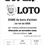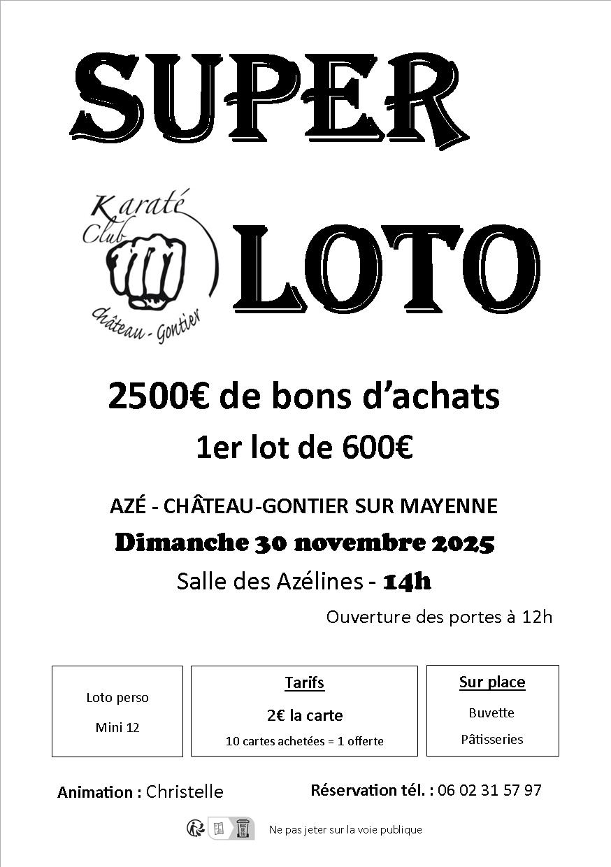 Le Karaté Club Château-Gontier organise son premier Loto à Azé. 2500 € de bons d'achats. Ouverture des portes 12h. Début du tirage 14h. Animation Eric. Réservations au 06 02 31 57 97.