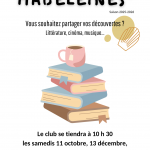 Pour partager un moment convivial en échangeant sur les découvertes ou coups de cœur littéraires, cinématographiques ou musicaux. Ouvert à tous sans inscription.