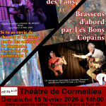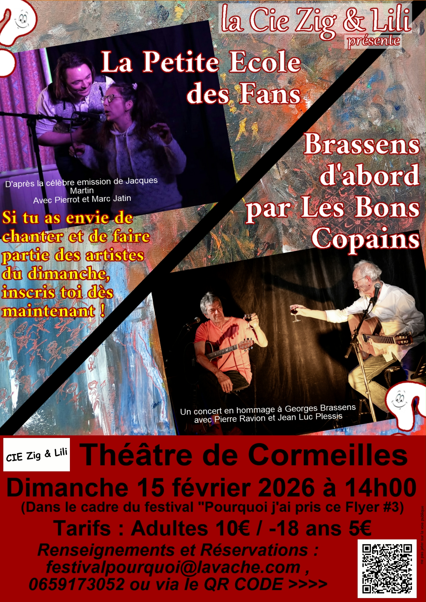 dimanche 15 février à partir de 14h00 : Après-midi familial avec "La petite école des fans" par la Compagnie Zig et Lili (tout le monde peut s'inscrire pour venir chanter) suivi du duo "Brassens d'abord par Les Bons Copains".