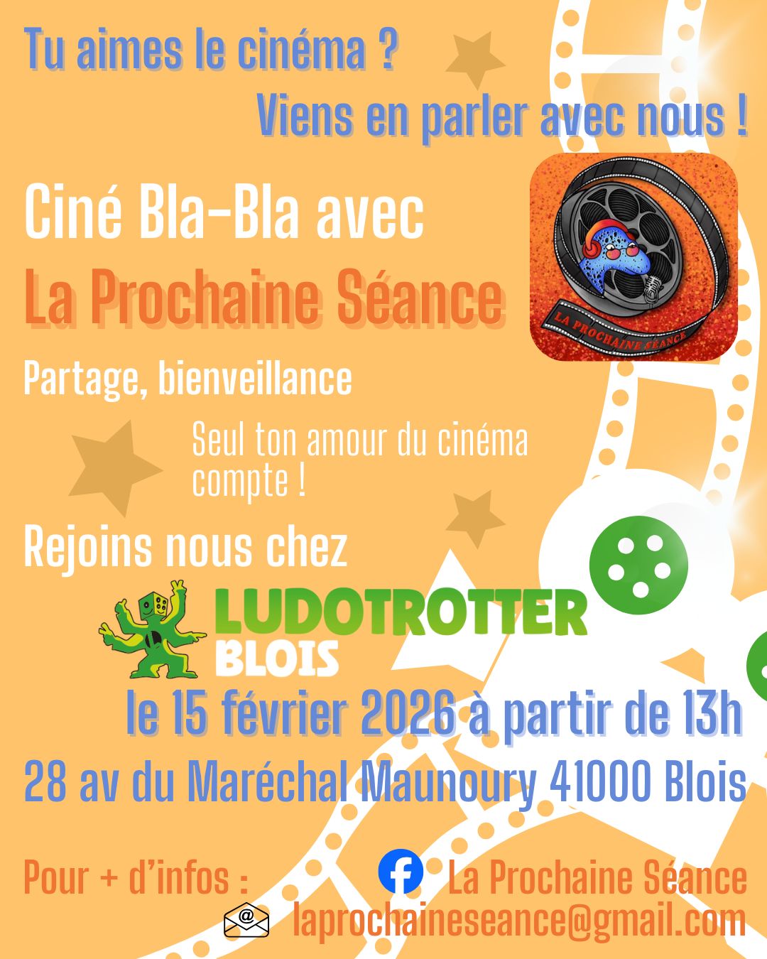 Vous désirez parler cinéma ? Envie de partager votre dernière découverte en salles ou bien sur les plateformes de streaming ? Alors, rejoignez les membres de l'association La Prochaine Séance, qui organise cette rencontre autour du 7ème art. Afin que chacun puisse discuter librement sur les films du moment, le tout avec passion et bonne humeur.