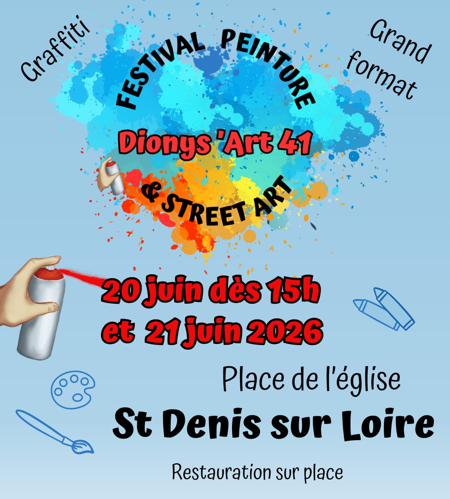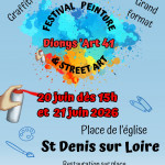Ce festival de peinture en grands formats, graffitis ,street art et techniques mixtes reçoit des artistes en résidence à Saint Denis sur Loire. Les artistes réalisent leur œuvre en direct dans les rues du village durant tout le week end et les visiteurs peuvent assister à leur création et échanger avec eux.