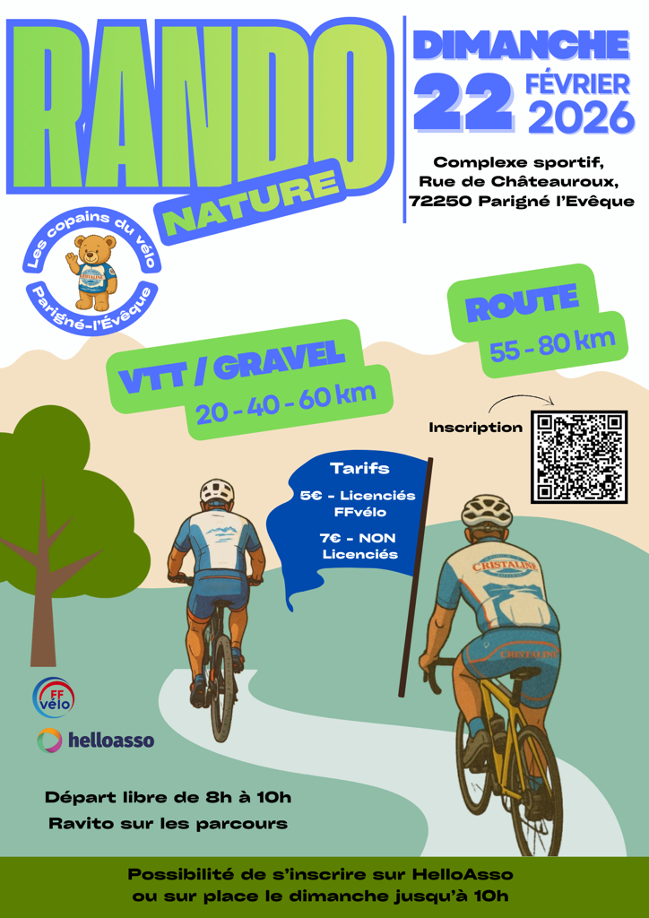 Le Club " Les copains du Vélo ", de Parigné-l'Évêque (72) vous convie à la Rando'Nature, randonnée annuelle, ouverte à tous les amateurs de VTT et Gravel, ou vélo de route !