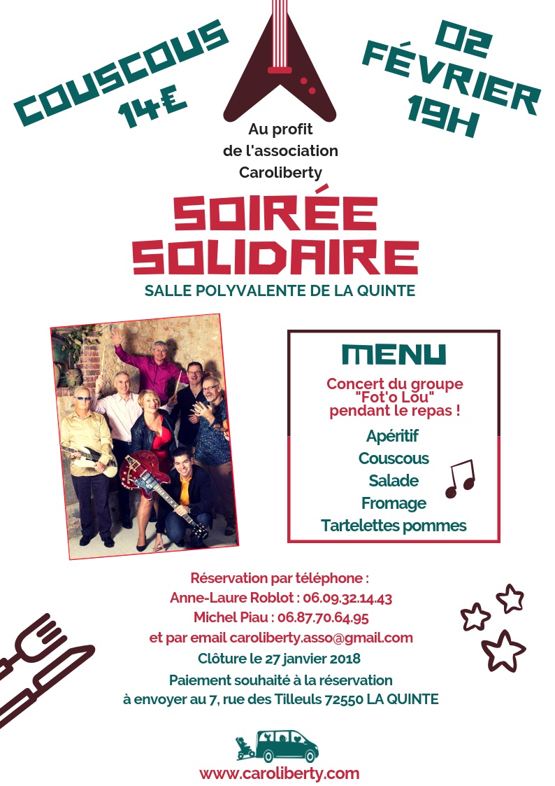 L'association Caroliberty vous accueille à la salle des fêtes de La Quinte le 02 Février à 19h pour notre soirée couscous solidaire animée par le groupe de blues rock pop sarthois Fot'O Lou. Les fonds serviront à financer notre premier projet, l'indépendance de Caroline, jeune femme en situation d'handicap pour acquérir sa voiture adaptée et son nouveau fauteuil électrique. Réponse souhaitée avant le 27 janvier 2019.